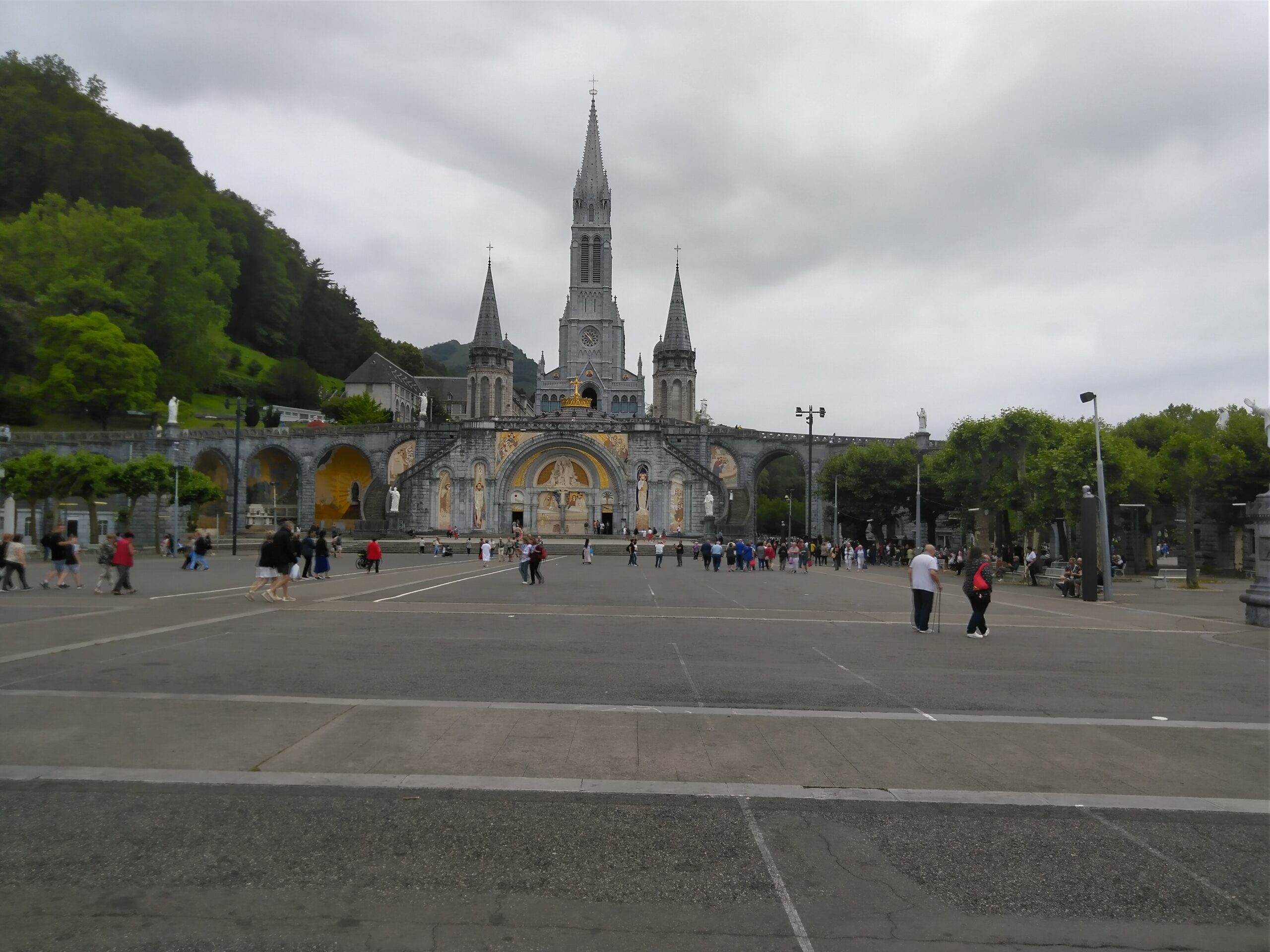 Kävimme Lourdes’in ihmekaupungissa kävelyllä. Yleisen uskontojen (kaikkien niiden) järjettömyyden kummastelun ohella kävimme ottamassa pakollisen turistikuvan paikasta, johon tekee vuosittain pyhiinvaelluksen useampi miljoona ihmistä.