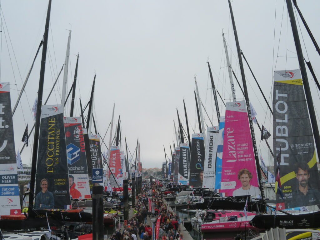 Olimme käyneet keskiviikkona katsomassa Chenal’in varressa, että kyllä tänne jonnekin sopii katsomaan, virhearvio. Tulimme (omasta mielestämme) sunnuntai-aamuna hyvissä ajoin, mutta kaikki Chenal’in reunapaikat olivat jo varattuja. Meren rannan lähelle oli laitettu iso screeni ja menimmekin katsomaan veneiden lähtöä siitä. Sille paikalle näkyi Chenal’issa ohi menevistä veneistä mastot ja merelle saavuttua näkyi sitten koko vene.