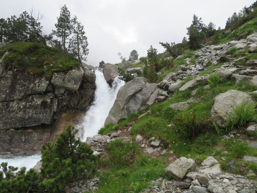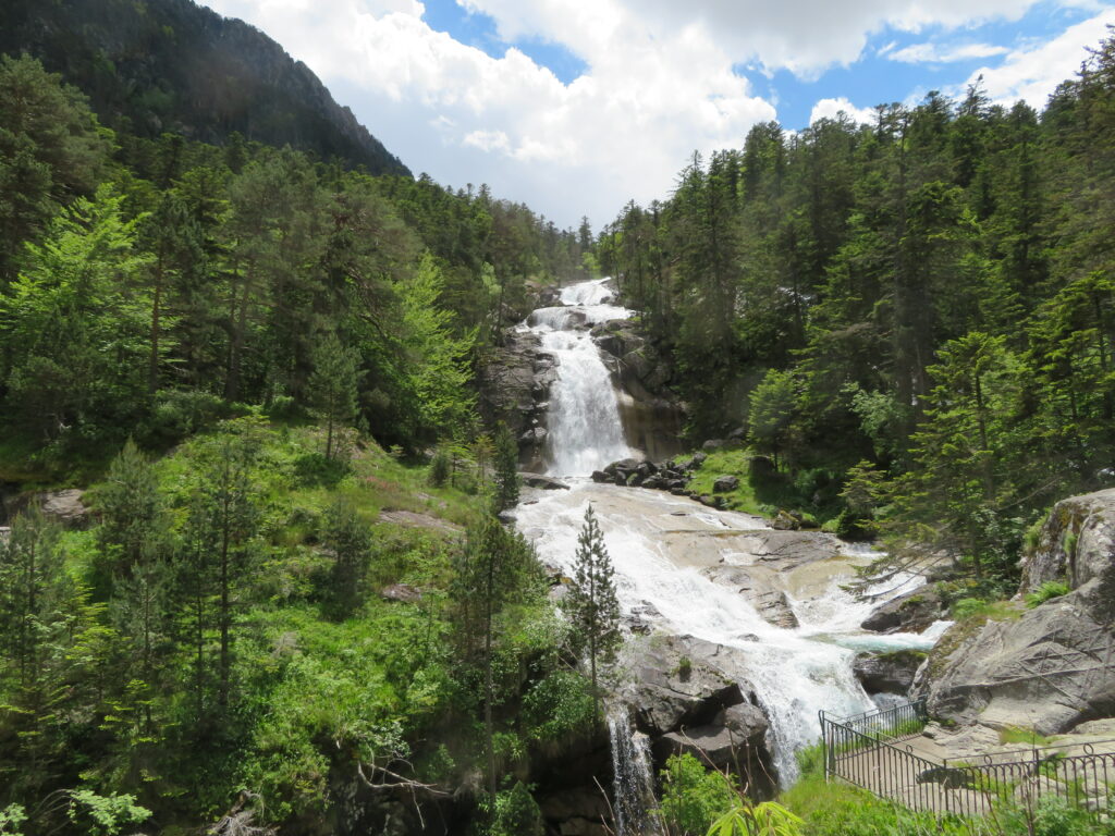Lauantaina jatkoimme laskeutumista ja maisemaan ilmaantui lehtipuita ja villisikojen tonkimia niittyalueita. Purot muuttuivat aina vaan isommiksi ja vesiputoukset komeammiksi. Upeimmat olivat Pont d’Espagne’en kohdalla. Tasamaan tallaajan näkökannalta koko väli Pont d’Espagne’esta La Raillere’en on yhtä koskea tai putousta.