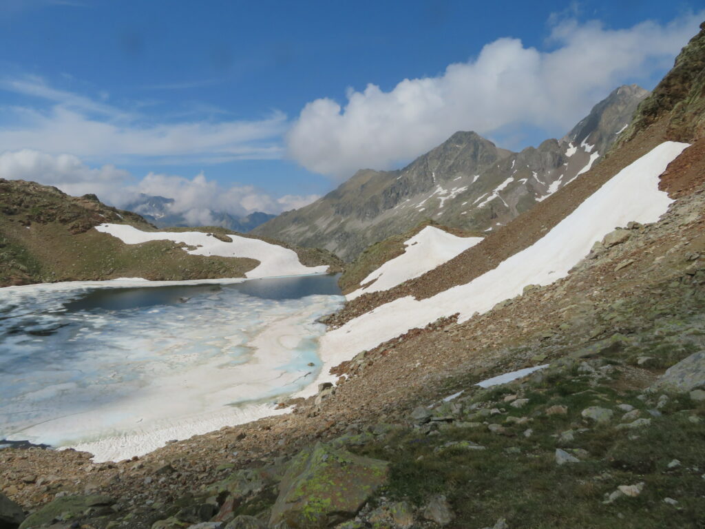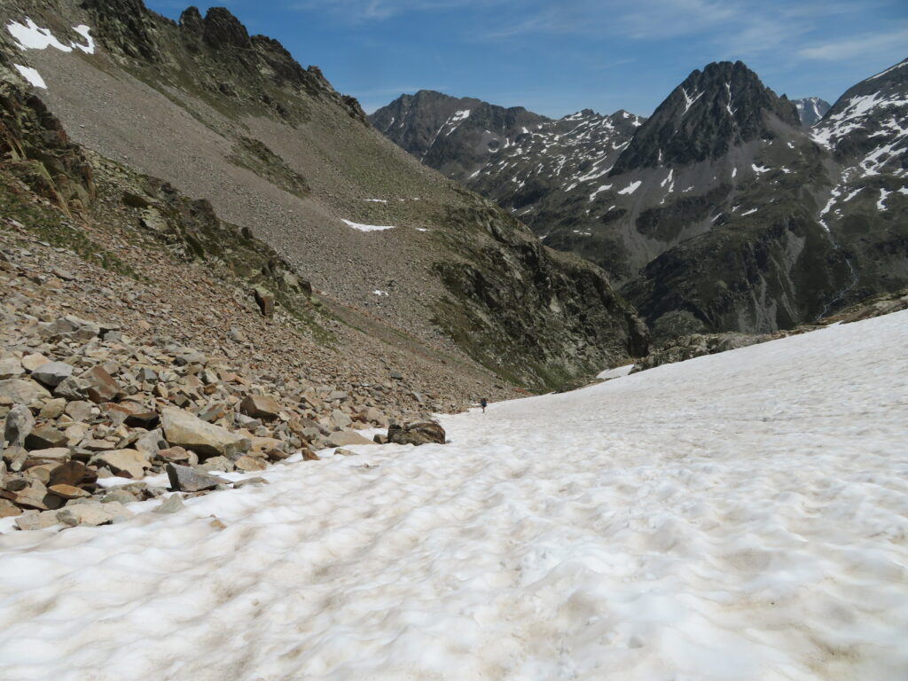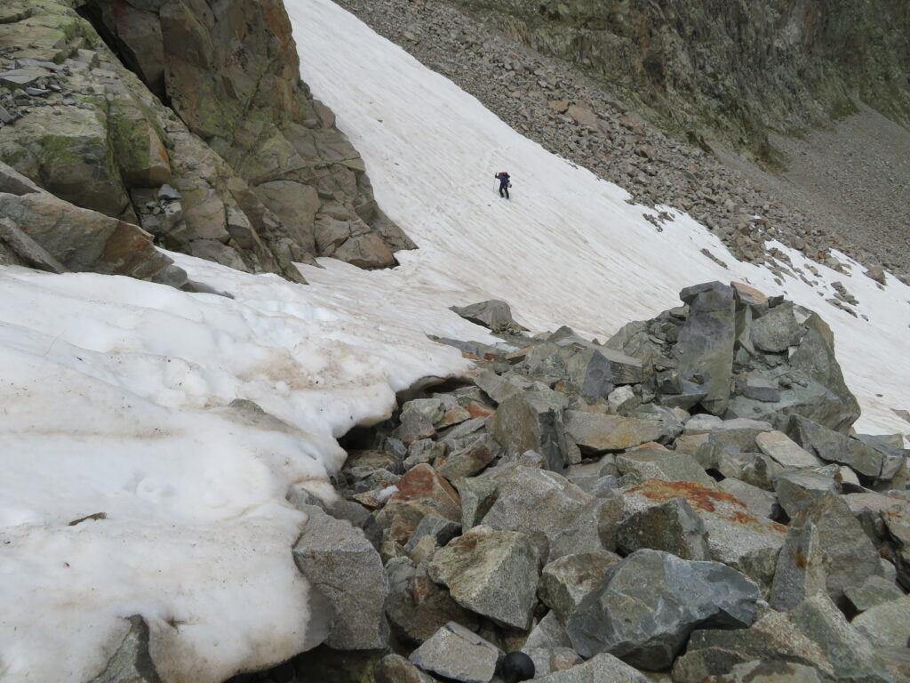 Jatko Col d’Arratille’elle oli melkein koko matka louhikkoa, mutta ei onneksi kovinkaan vaikeakulkuista. Vähän ennen Col d’Arratille’ea oli parinkymmenen metrin aika vaikea nousu. Tasamaan tallaaja piti sitä jo miltei vuorikiipeilynä! Oikeat vuorikiipeilijät ovat varmaankin asiasta eri mieltä, mutta heillä ei yleensä olekaan painavaa vaellusrinkkaa selässä. Col d’Arratille’en jälkeen olimmekin taas Ranskan puolella. Laskeutumisessa oli vielä muutama lumialueen ylitys, mutta ne olivat niin lyhyitä ja helppoja, että crampons’eihin ei tarvinnut enää turvautua.