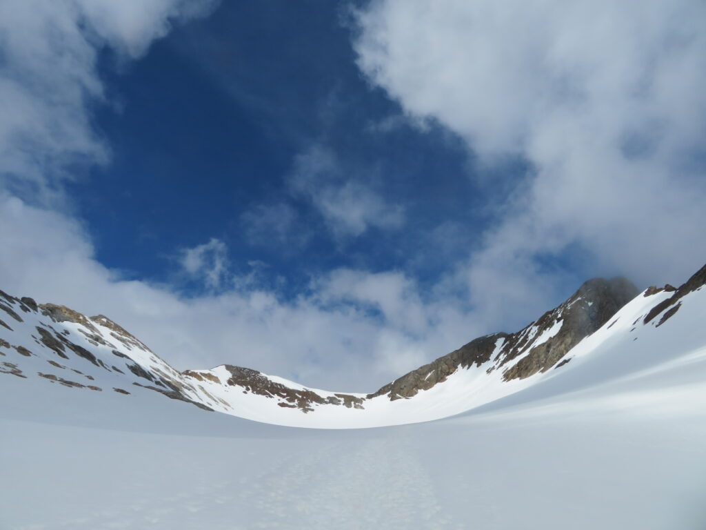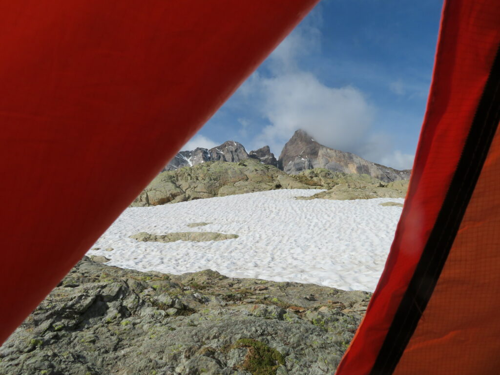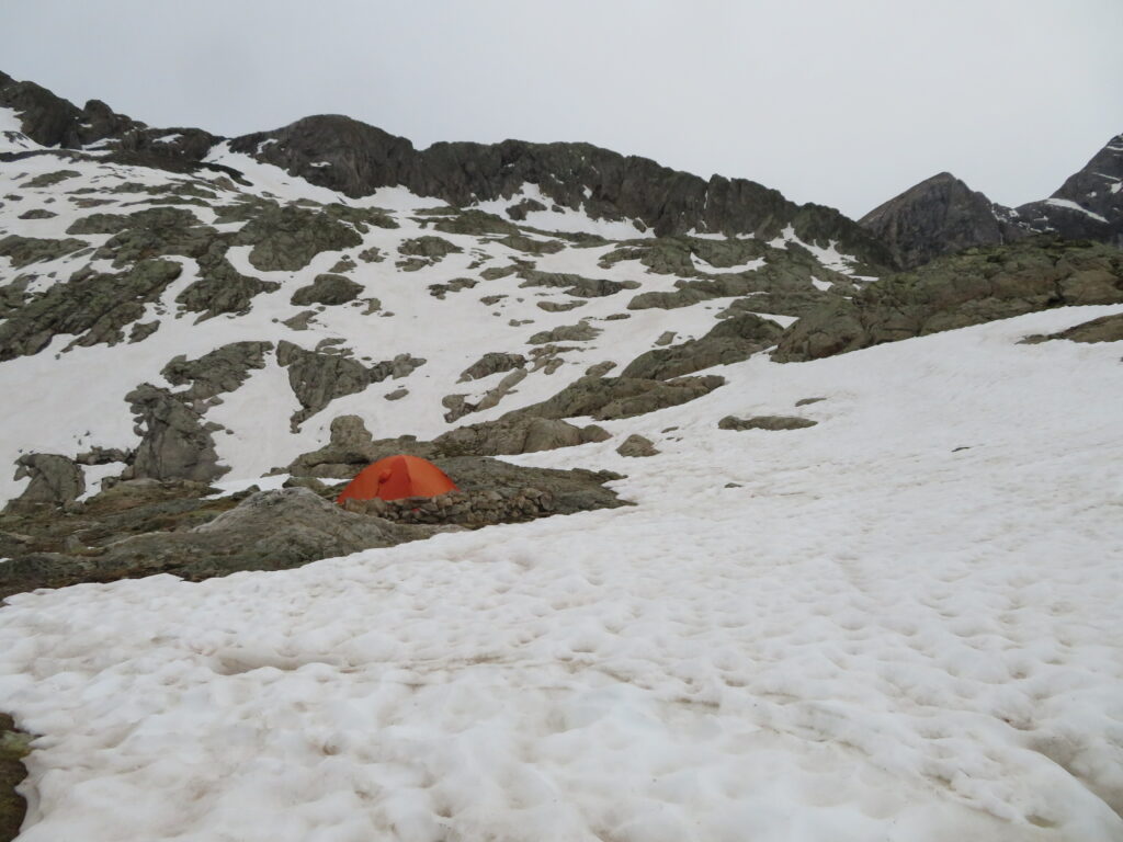 Eteneminen oli siis ennakkoarviota hitaampaa. Kun (yllättäen) löysimme miltei täydellisen telttapaikan matkan varrelta, niin päätimme ottaa bivouac’in n. 2560 m korkeudessa ennen nousua Hourquette d’Ossoue’lle. Yö oli kylmä! Muutama aste pakkasta, koska lumen pinta oli jäätynyt yön aikana rapeaksi.