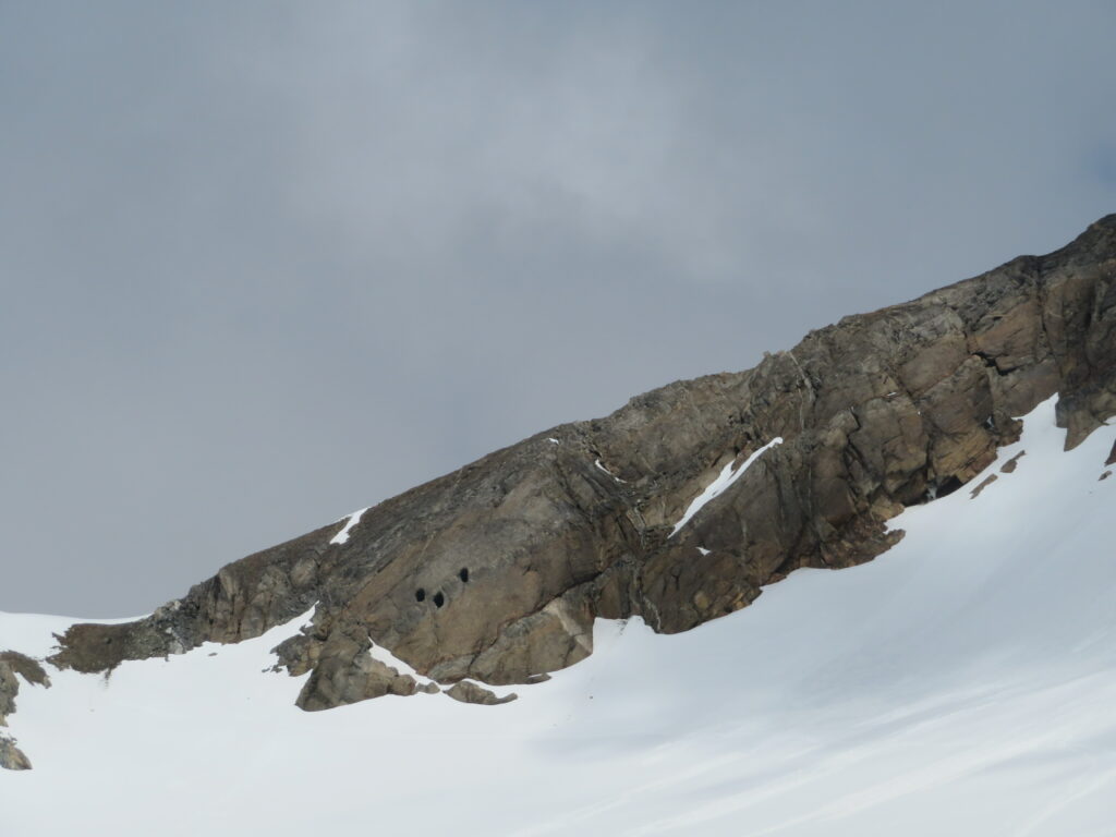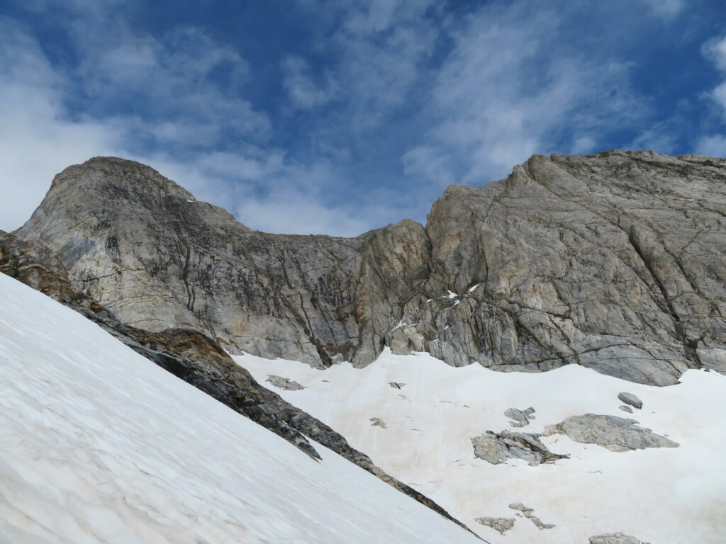 Torstai-aamuna lähdimme kohti Col des Mulets’ia. Reitti louhikon läpi oli hieman hakusalla ja muutenkaan nousu louhikossa ei oikein edennyt. Otimme tekniikan avuksi: Laitoimme crampons’it jalkaan ja nousimme suorinta tietä lumikentän yli Col des Mulets’ille. Sen jälkeen olimmekin Espanjan puolella.