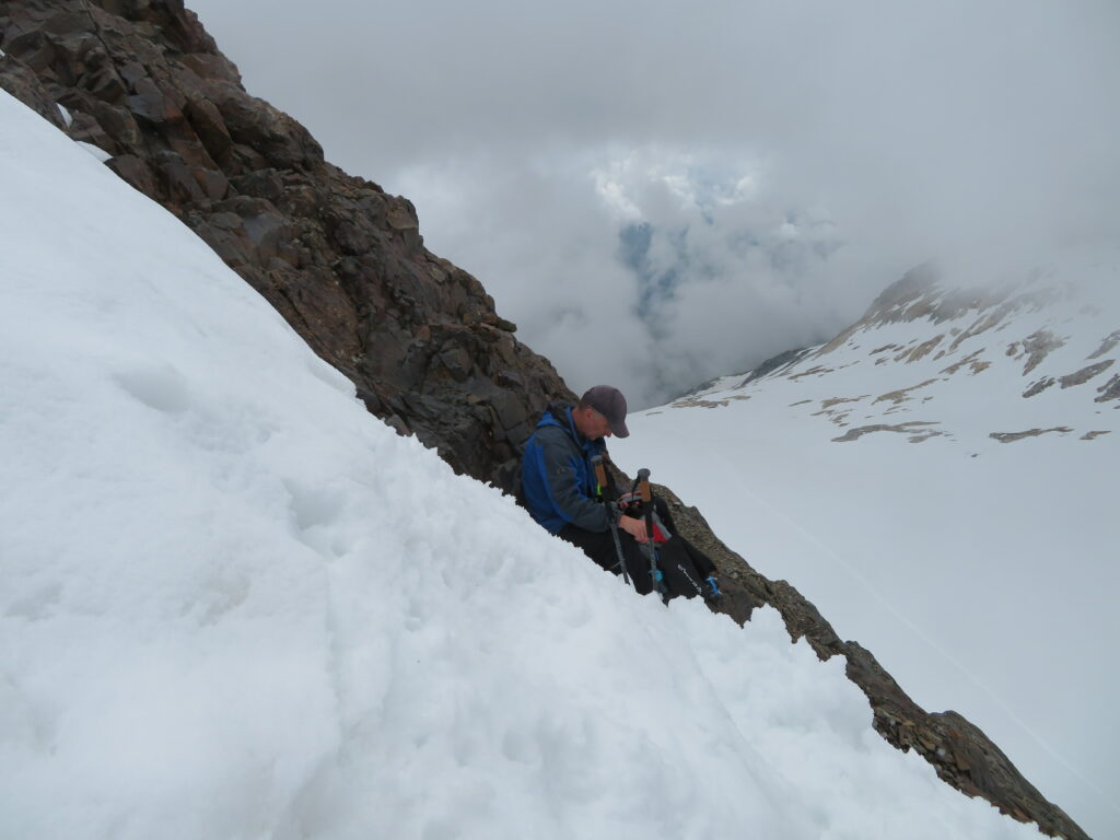 Lähtiessämme vesisade oli hieman vähentynyt aikaisemmasta, mutta se oli korvattu tuulella ja vielä huonommalla näkyvyydellä. Paluumatka alkoi aika huonosti: Melkein heti Hourquette d’Ossoue’n jälkeen menimme harhapolulle ja olemattoman näkyvyyden takia emme huomanneet sitä! Kiertelimme hyvän aikaa lumella ennen kuin pääsimme takaisin Hourquette d’Ossoue’lle. Toinen yritys tehtiin sitten huolellisemmin.