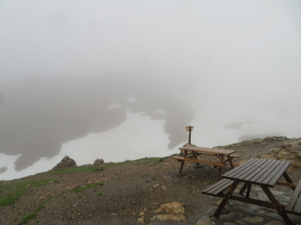 Keskiviikko-aamupäivälle olimme suunnitelleet pikavisiittiä Petit Vignemale’elle, joka oli melkein “paluumatkan varrella”. Suorituksena nousu sinne olisi ollut eilisen jälkeen vain “pieni aamulenkki” raikkaassa vuoristoilmassa. Vuoriston sää näytti kuitenkin keskiviikkona melkein kaikki huonot puolensa: sadetta, tuulta ja olematon näkyvyys n. 20 m. Ainoastaan kylmyys puuttui valikoimasta. Päätimme siis, luonnon avustuksella, jättää väliin maisemien ihailun Petit Vignemale’en huipulta ja lähdimme heti aamusta paluumatkalle.