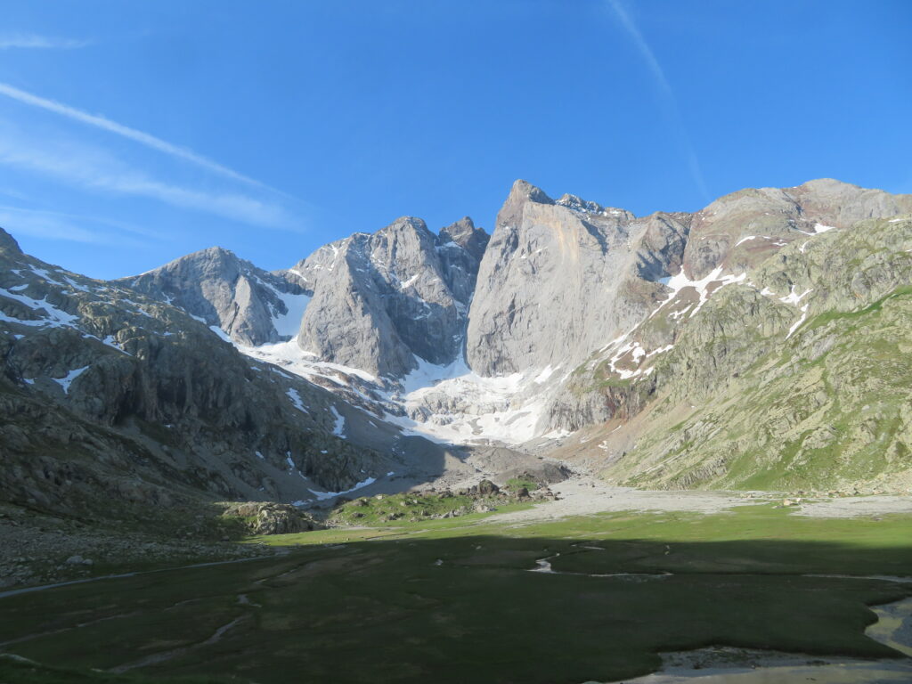 Aamutoimet olivat tyypillisen hitaat ja pääsimme liikkeelle vasta vähän ennen yhtätoista. Nousussa Hourquette d’Ossoue’lle oli lunta ja crampons’it tulivat taas käyttöön. Polku oli jo ennen sitä paikoitellen lumen alla, joten reitin valinta oli hyvinkin vapaata.