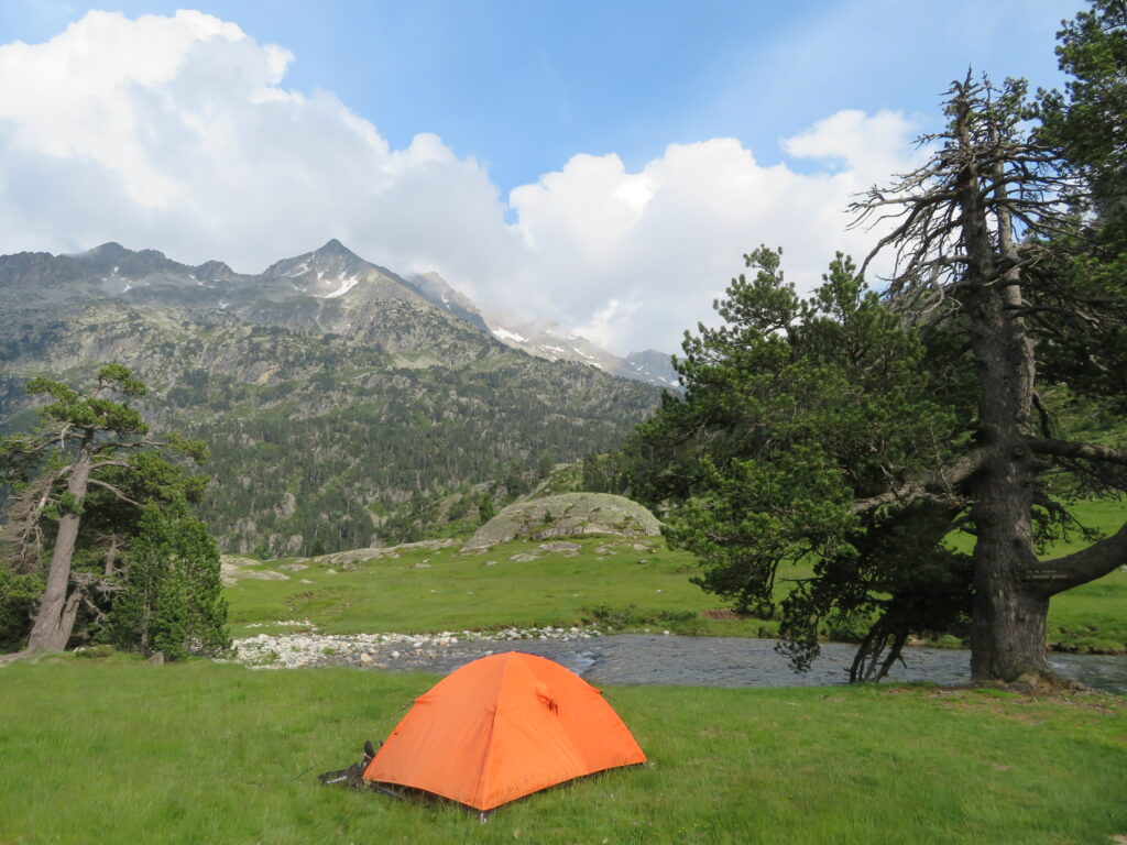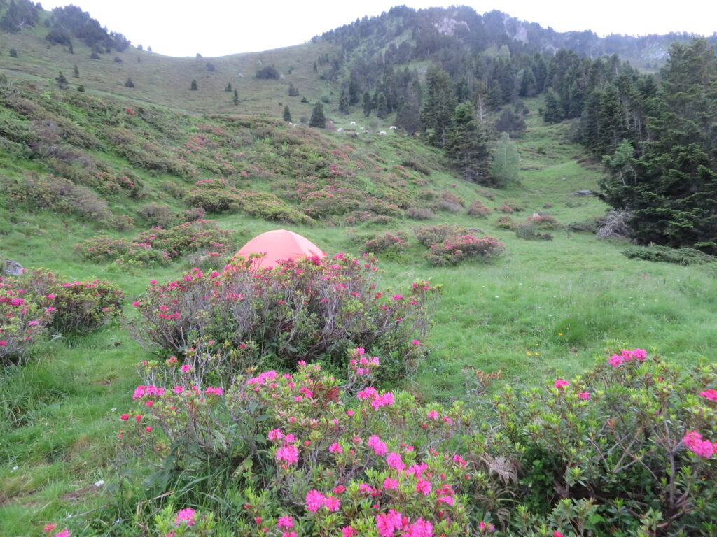 Iltapäivällä olimme jo alle 2000 m korkeudessa ja maisemaan ilmaantui puita ja pieniä metsiköitä. Yövyimme Refuge Wallon’in bivouac-alueella (n. 1860 m) joen varressa.